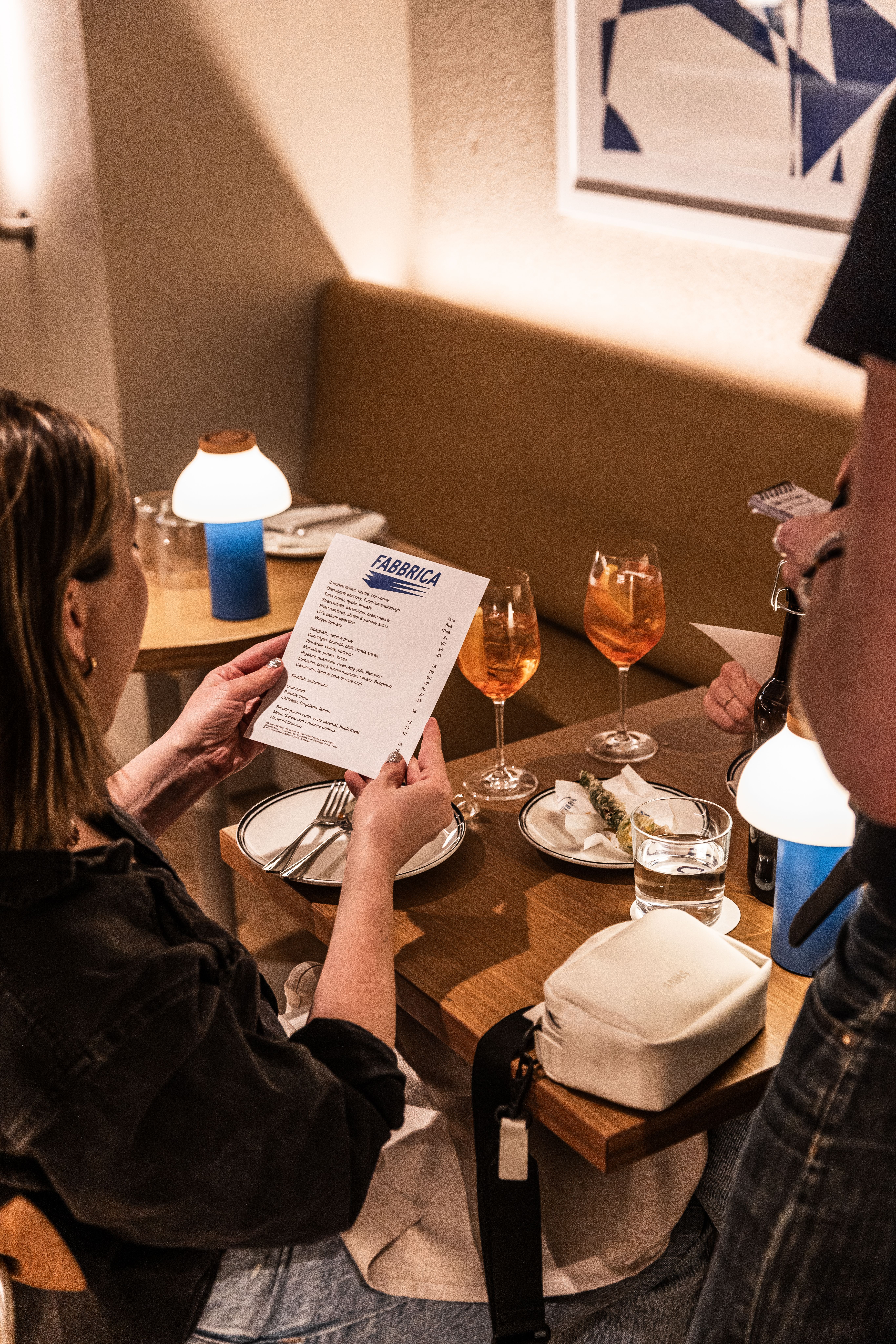 Fabbrica Newtown is centred around a long, travertine-topped counter overlooking the open kitchen and bar. Spanning several lively spaces, including a central banquette area and a dining room beneath a series of skylights, Fabbrica Newtown can seat groups of up to 24. Exclusive hire can also be arranged upon request.