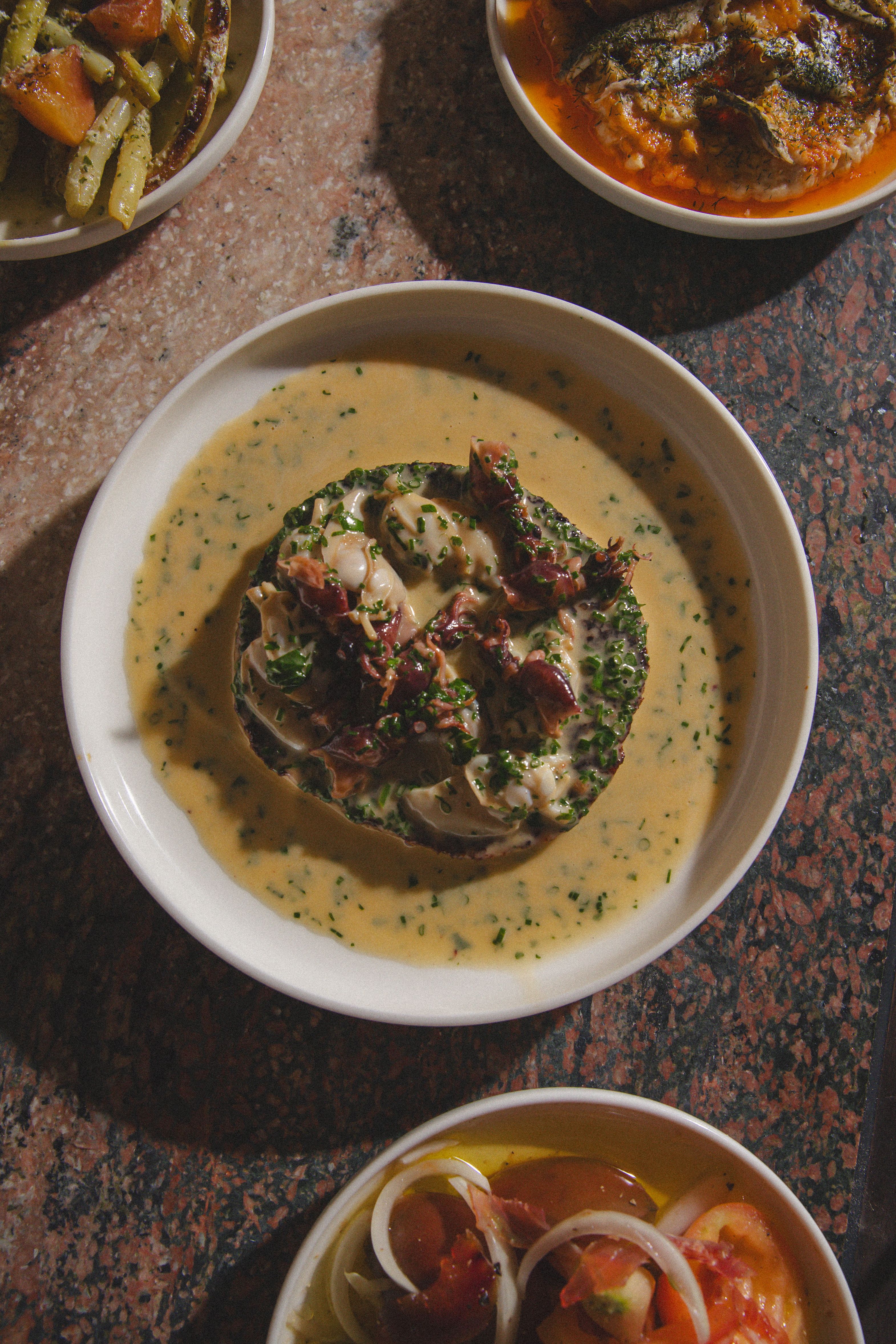 At the moment, it’s topped with firefly squid, mussels and vongole, with spoonfuls of golden Spanish vinegar–spiked beurre blanc.